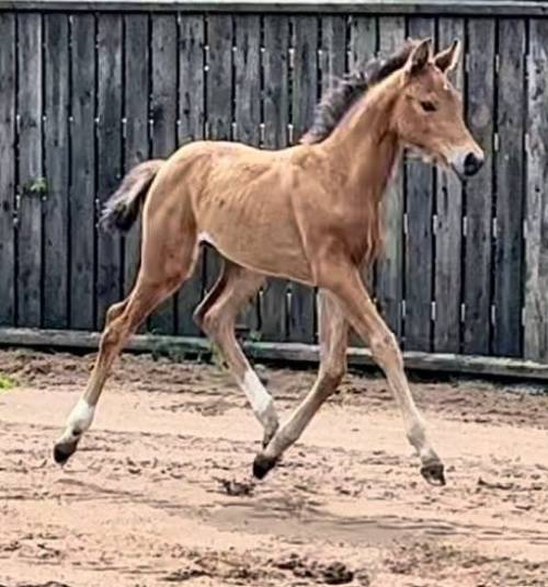 RoundThorn Tailor Maid, Born in 2024,16.2hh, Bay ISH Filly by Escolar (Estobar NRW x Furst Piccolo x Sion) out of Floh Jo (Furst Romancier x Carpaccio x Ricardo), who is the half sister of several International Grand Prix horses, as well as the full sister of the licensed stallion Fred Astaire.