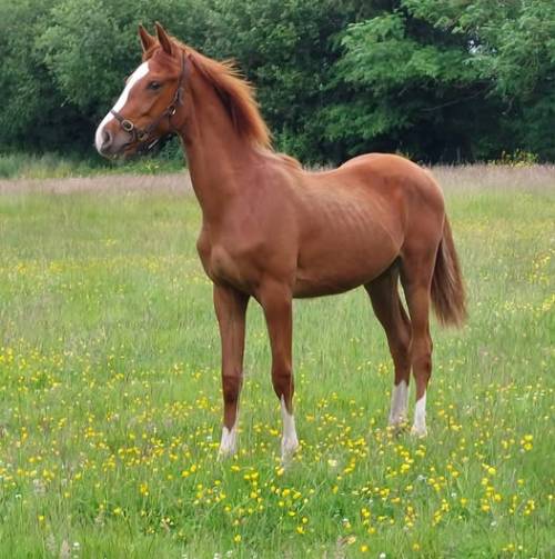 RoundThorn Slainte, Born in 2023, To make 16.2hh, Chestnut ISH Colt by Candy De Nantuel (Luidam x Diamant De Semilly x Quidam De Revel), out of Atricia RoundThorn, KWPN Mare, (Padinus x Burggraaf x Le Mexico).